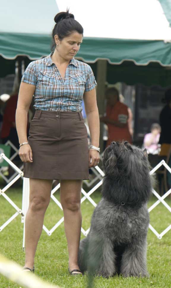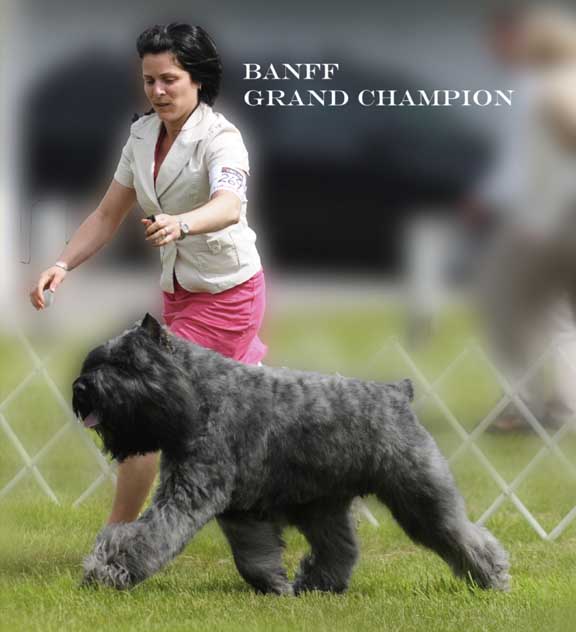 Banff est un mâle de 26 ½ pouces à l’épaule et son poids est de 88 lbs. C’est un chien exceptionnel. Il a obtenu ses trois titres d’obéissance en 11 mois et il a été champion d’obéissance à l’âge de 2 ½ ans. Banff a deux “best in show” dont un à l’âge de 11 mois. Il a obtenu deux “best in show réserve”. Il s’est aussi distingué à de multiples “placements de groupe” et “meilleur de la spécialité”. En 2009, il a terminé premier Bouvier des Flandres au Canada en conformation. La liste de ses reconnaissances est très longue et je crois qu’il serait difficile d’avoir un autre chien qui se démarque autant que Banff.